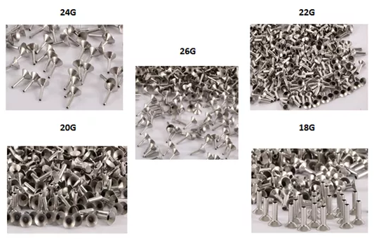 鉚釘選用進口不銹鋼材料,進行伸拉成型制作,具有優(yōu)異的耐腐蝕性和尺寸穩(wěn)定性,產(chǎn)品的表面粗糙度,內(nèi)外公差需精密控制,外直徑導(dǎo)向位和擴口導(dǎo)向位需符合標準通用尺寸及組裝需求,鉚釘現(xiàn)有規(guī)格:18G、20G、22G、24G和26G。